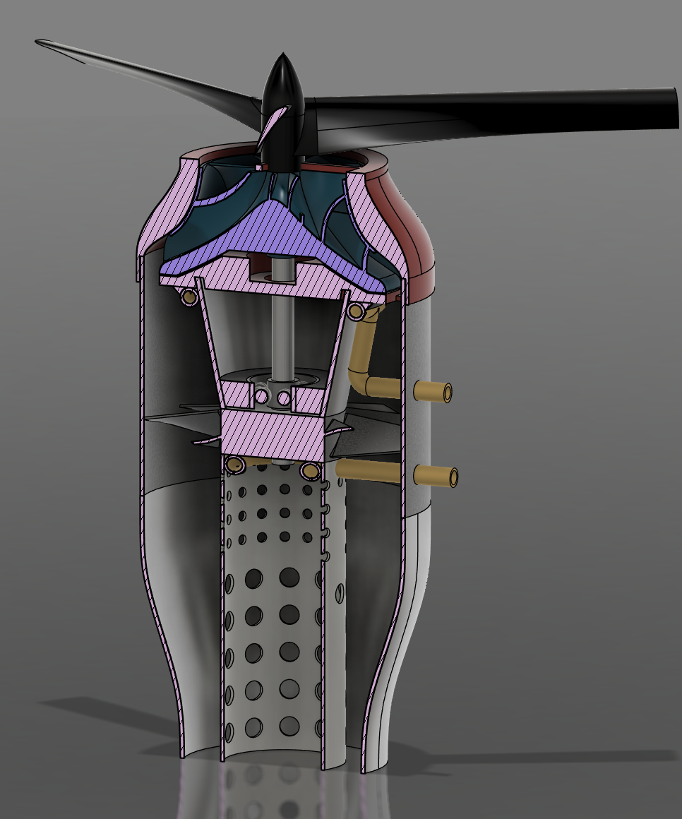 The above render is the first mock-up and has many issues. Firstly the volume of air should diminish as it traverses the impellor yet in this design the cross-section increases as it leaves the impellor. The aft section should also be accelerating the airflow whereas in this example it simply impedes it.